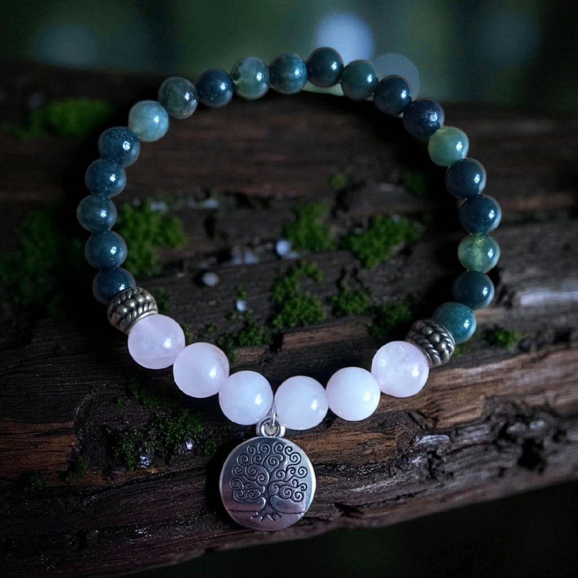 - Une association de pierres équilibrantes : Agate Mousse pour l’ancrage et la croissance, Quartz Rose pour l’amour et la sérénité.